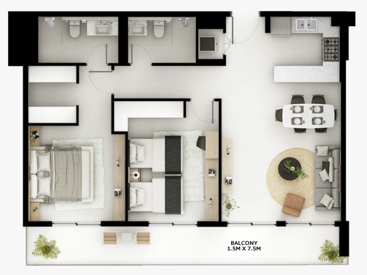 Basic equipment: each apartment has spacious layouts with large windows to maximize natural light. Kitchens are equipped with German brand appliances, including a gas stove, extractor hood, fridge freezer and washing machine.
