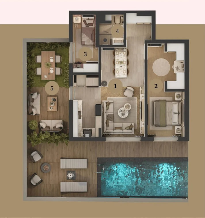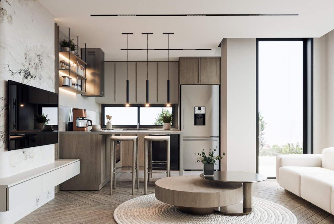 The apartments are delivered fully finished, with built-in kitchen cabinets and fully equipped bathrooms. The apartments are equipped with a smart home system, air conditioning, recessed lighting, and walk-in closets.