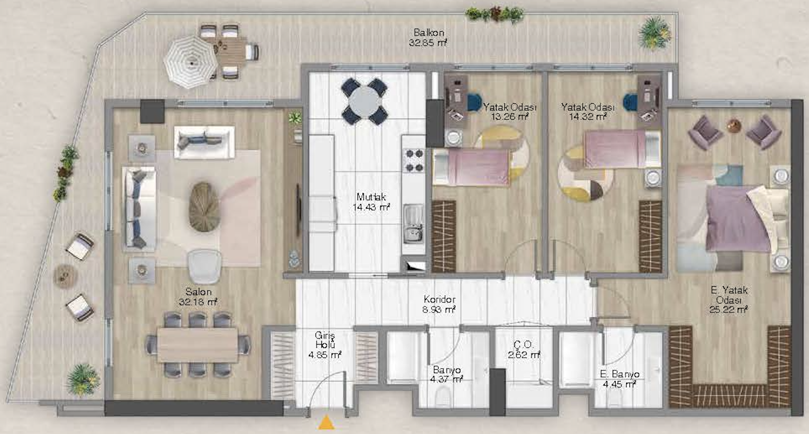 Layout: kitchen-living room and 3 bedrooms.