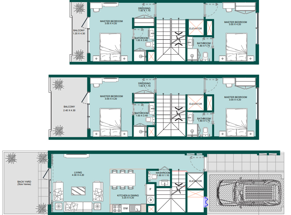 Basic equipment: private balcony, terraces according to the apartment layout, kitchen cabinets and countertops, fully tiled bathrooms, private and guest toilets, double glazed windows, shower in each bathroom, central air conditioning, dressing tables and mirrors, laundry and maid’s room in several townhouses, some bedrooms with private bathroom, townhouses with 4 bedrooms and internal elevator.