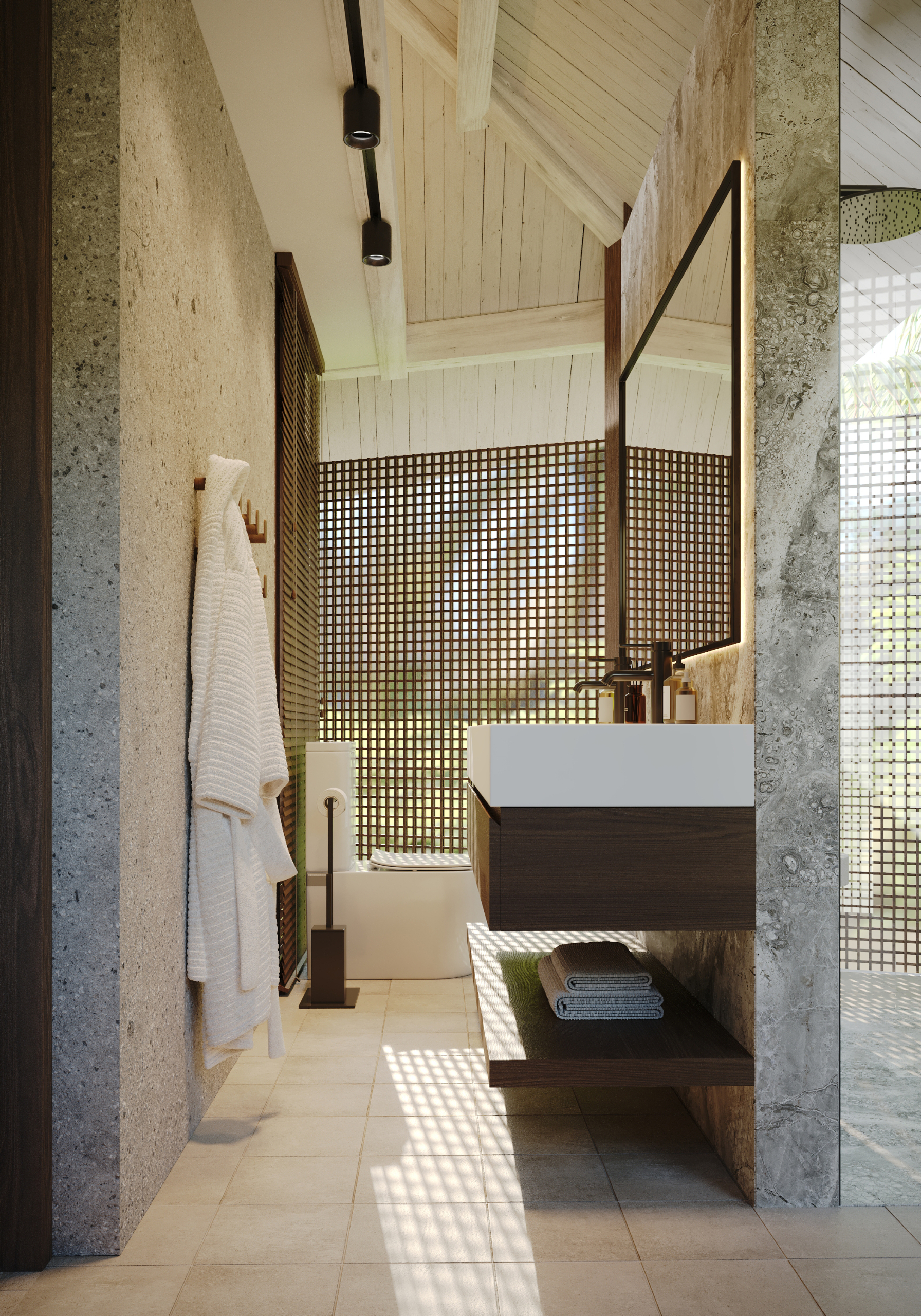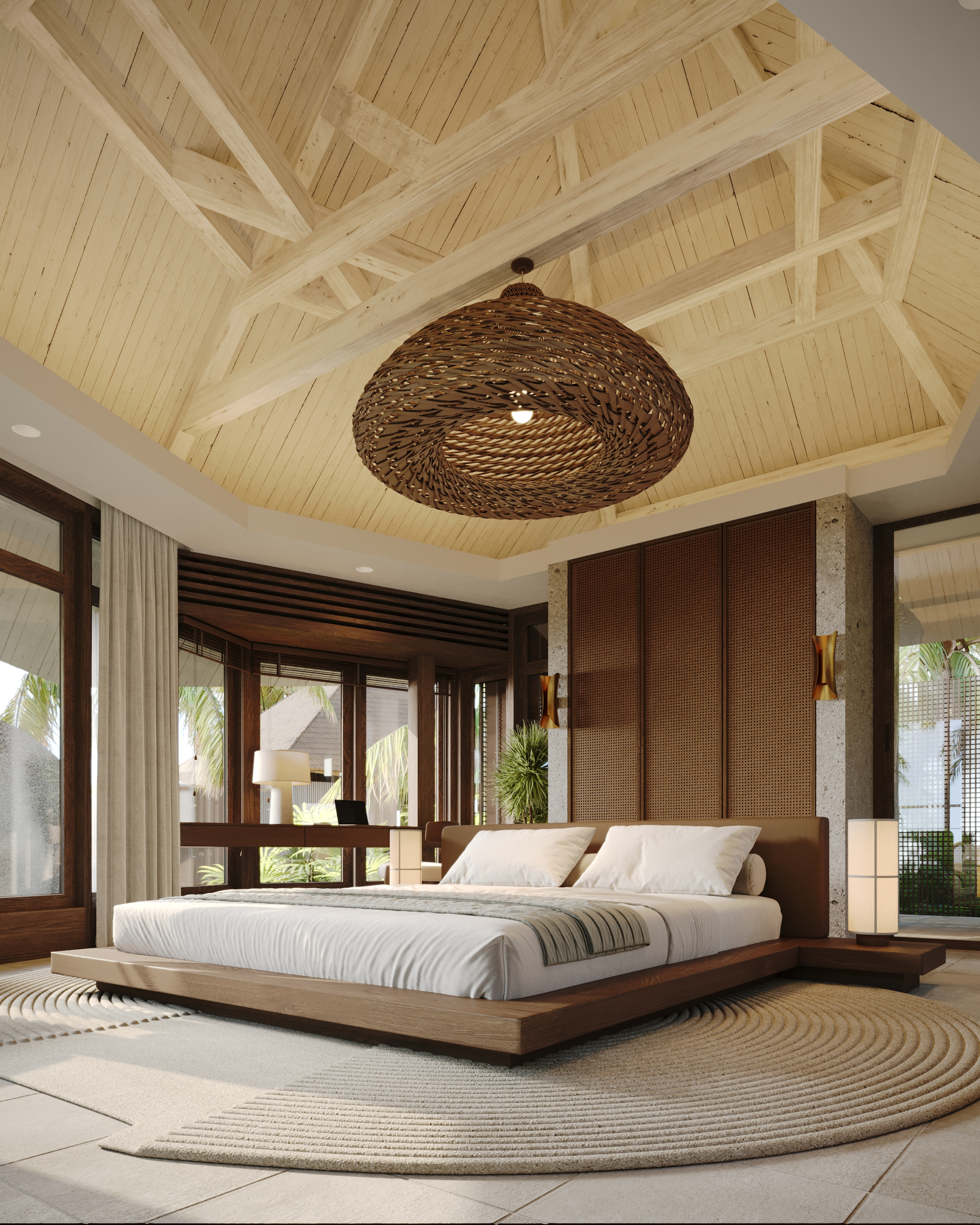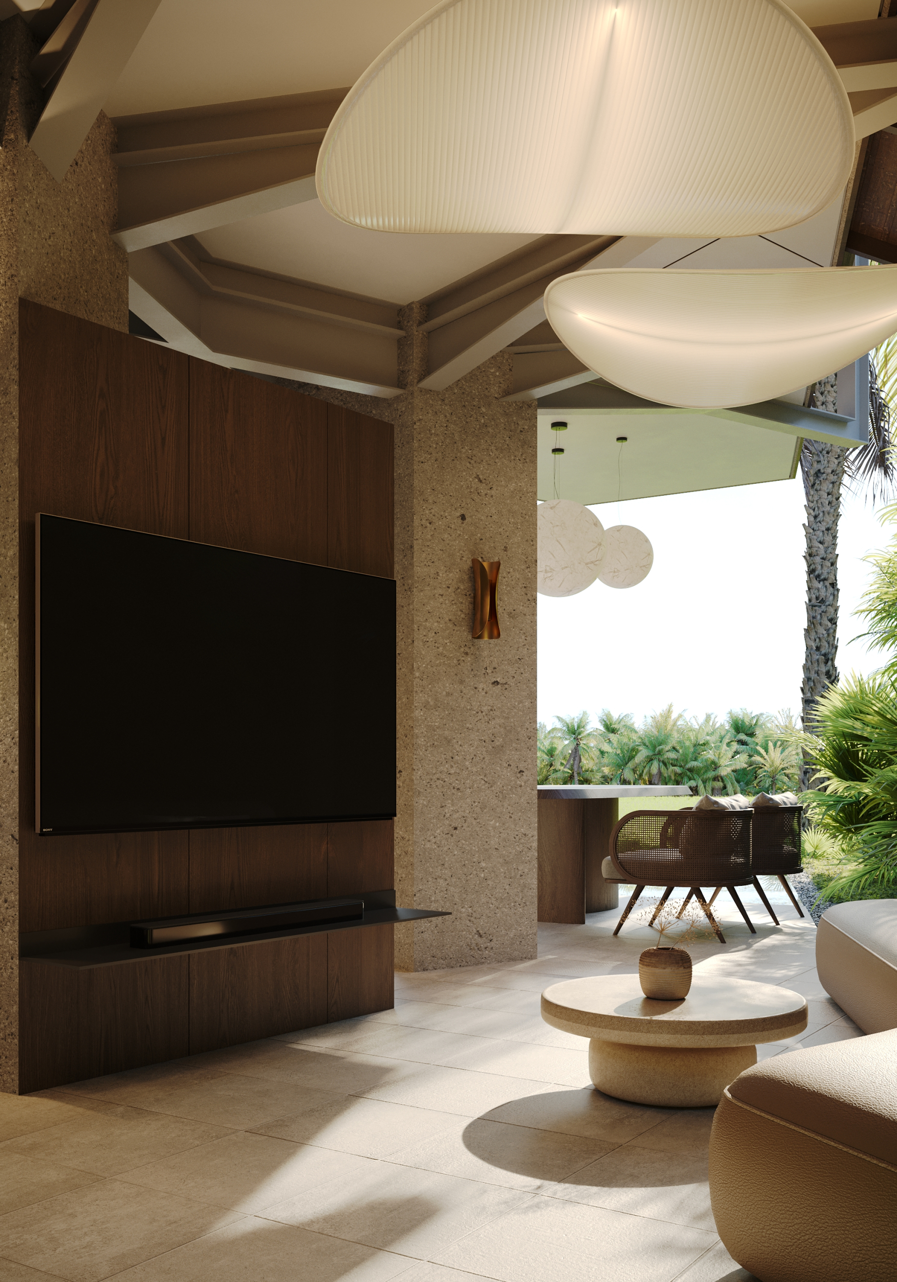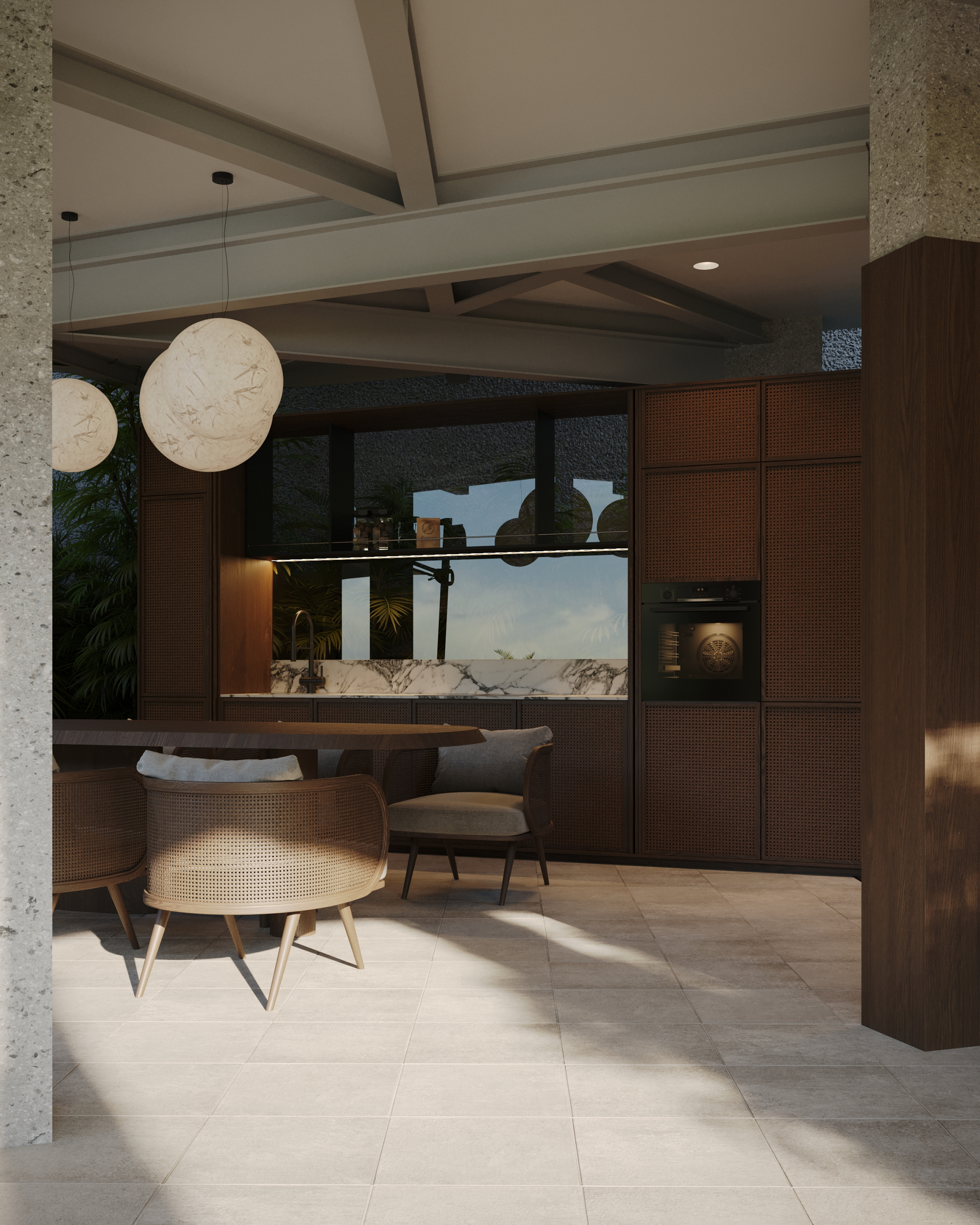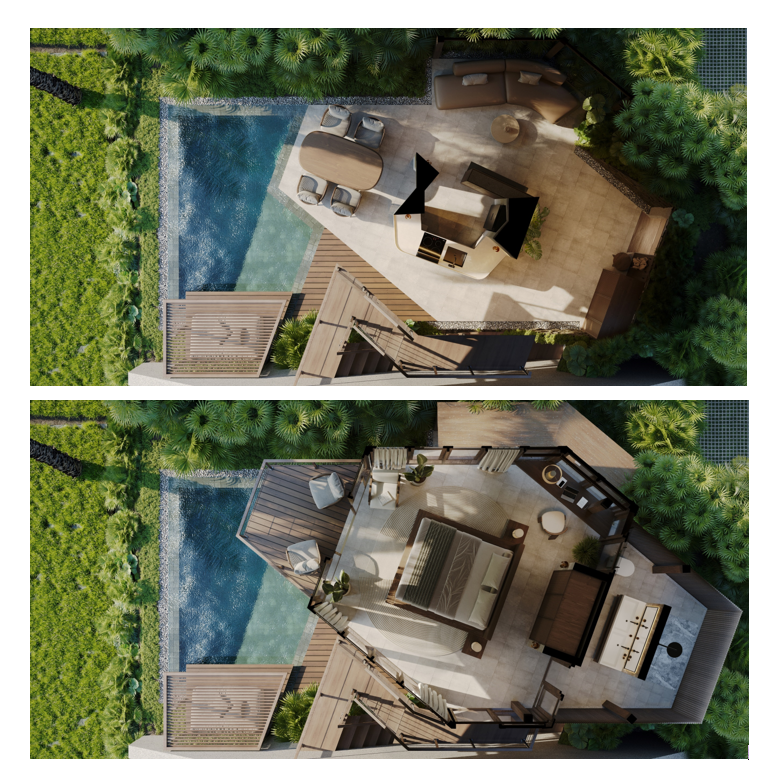 Basic: Interior decoration and full furnishing including kitchen set, beds, sofas, appliances and garden furniture (with roofline if available).