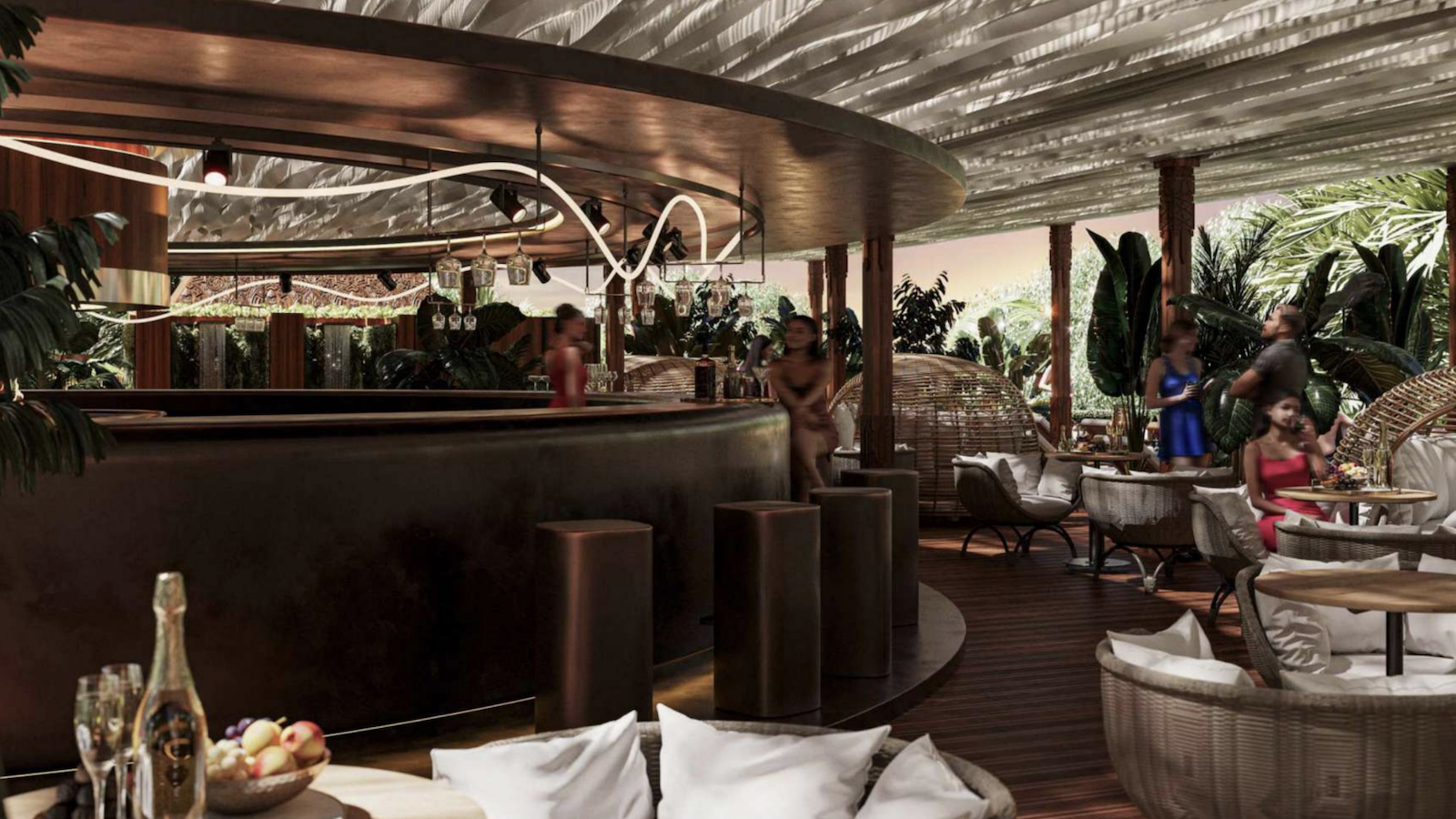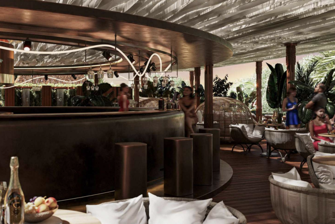 Инфраструктура комплекса: сад, детская площадка, ресторан, бар, бассейн, спортзал, подземная парковка, лобби.