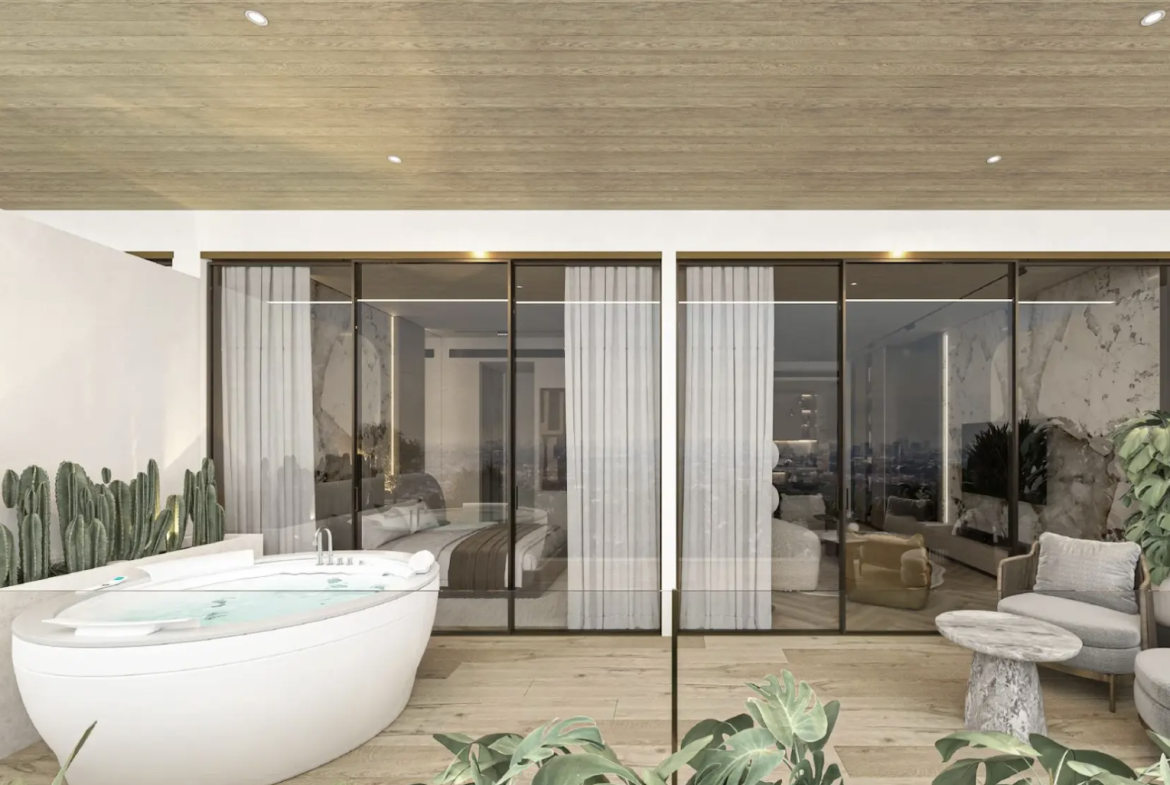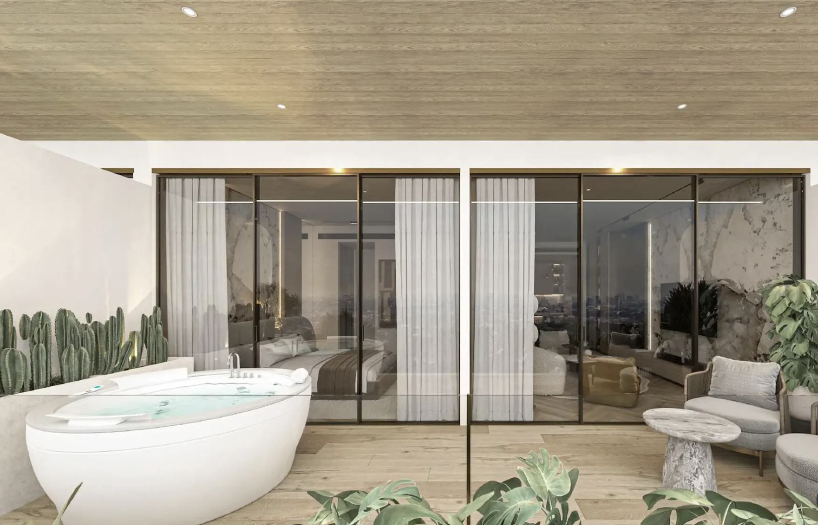 Инфраструктура комплекса: бассейн-инфинити, детский бассейн и игровая площадка, беговая дорожка, купол для йоги и зона для медитации, полностью оборудованный тренажерный зал, кинотеатр под открытым небом, теннисный корт, сад на крыше.