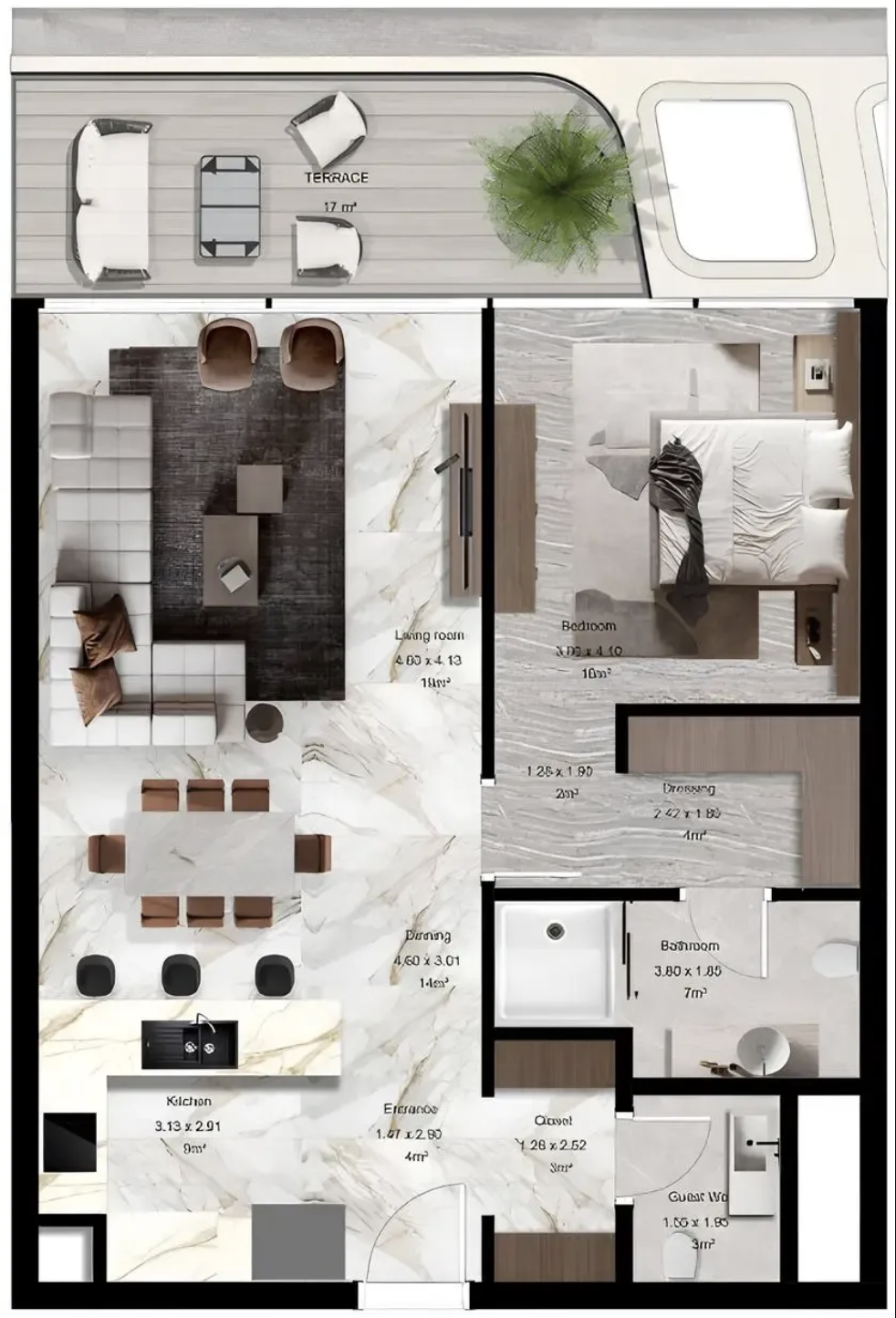 Базовая комплектация: современная отделка с использованием высококачественных материалов. Оборудованная кухня.