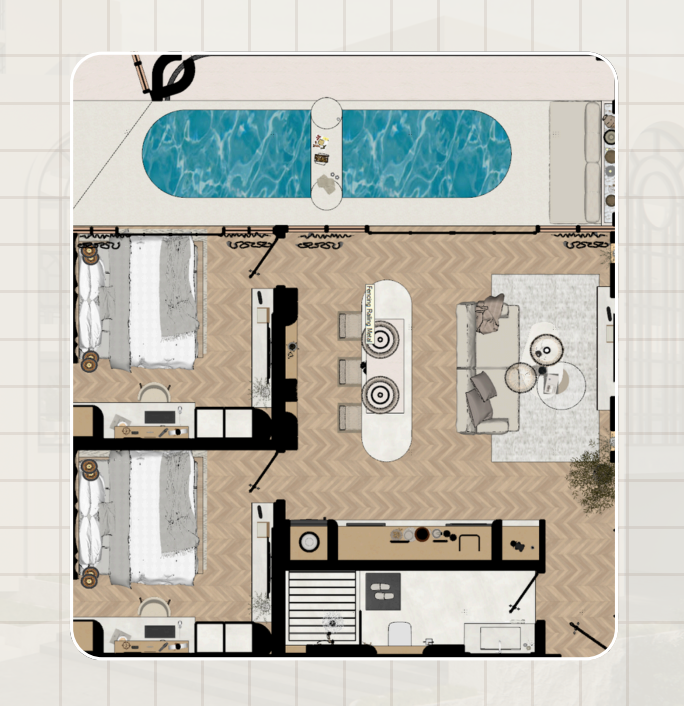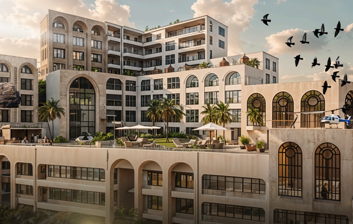 Инфраструктура комплекса: вертолетная площадка, корт для падель-тенниса, тренажерный зал, коворкинг-процедуры и расслабляющий бассейн с пляжной атмосферой.