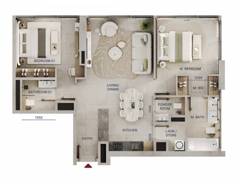 Базовая комплектация: квартиры в Mirdad by Union Properties оформлены в нейтральных тонах, что позволяет легко подобрать мебель на свой вкус. Кухни имеют открытую планировку: линейную или с островом, с местом для встроенной техники. В спальнях установлены просторные шкафы, а в ванных комнатах – крупная плитка и минималистичная сантехника.