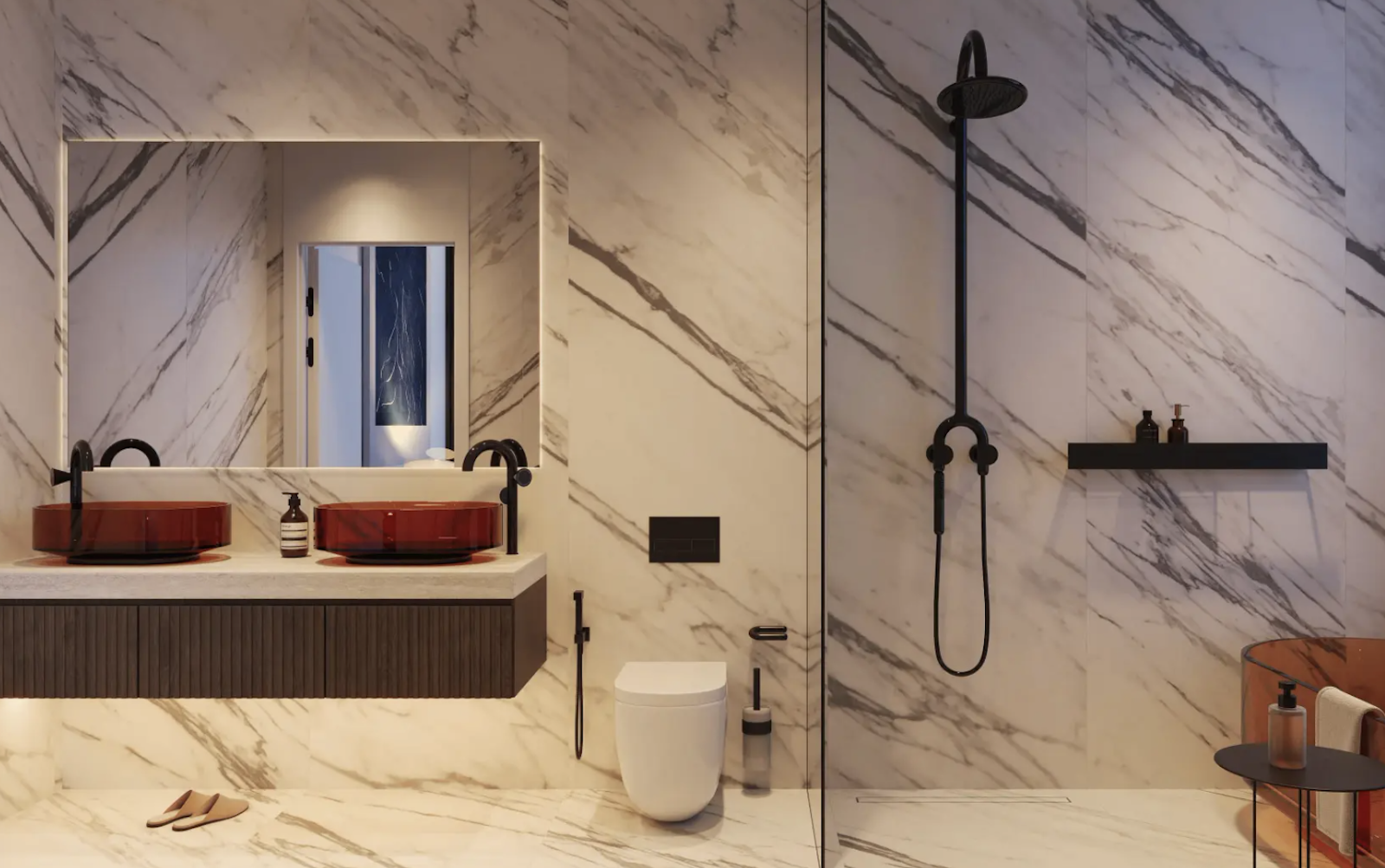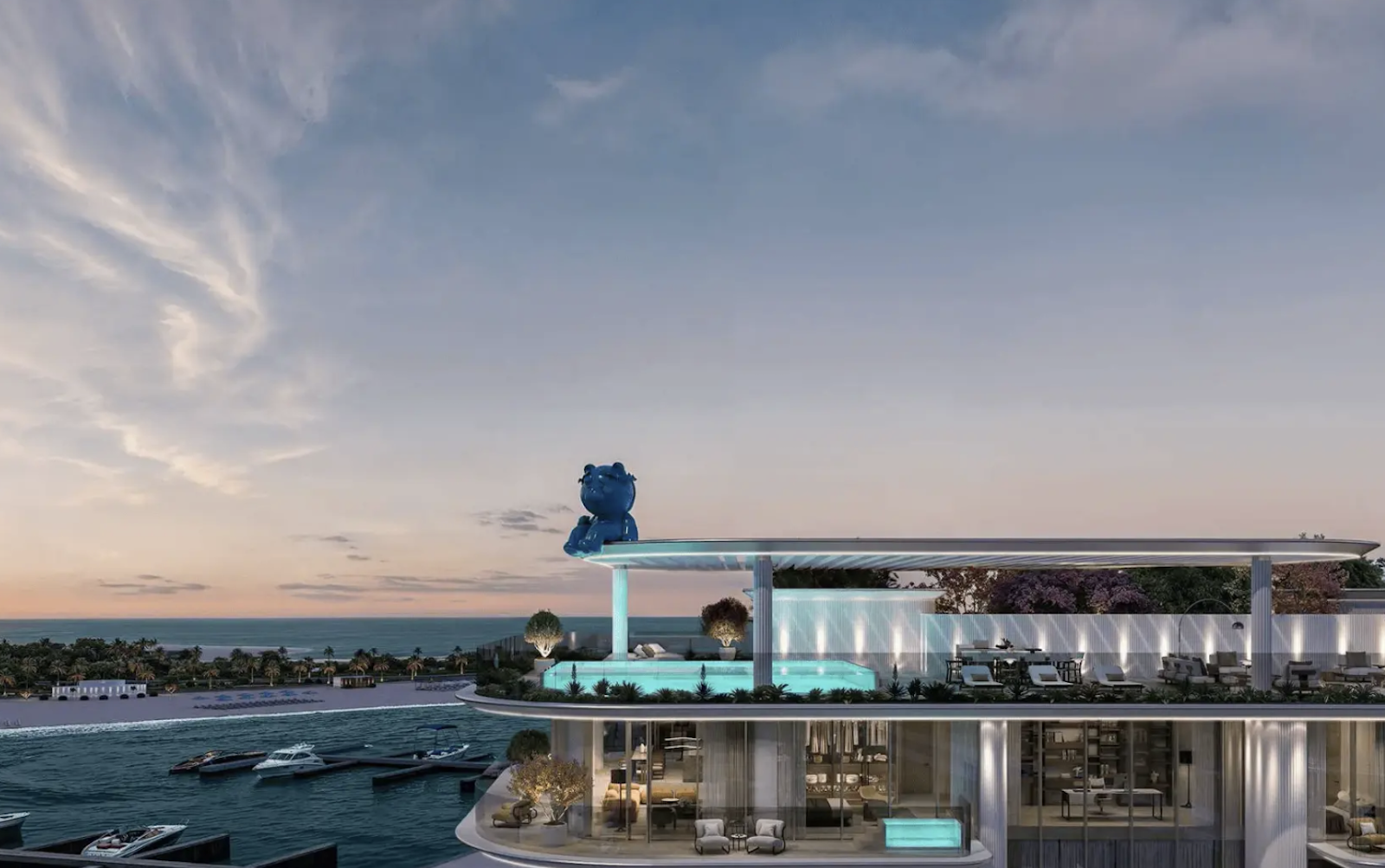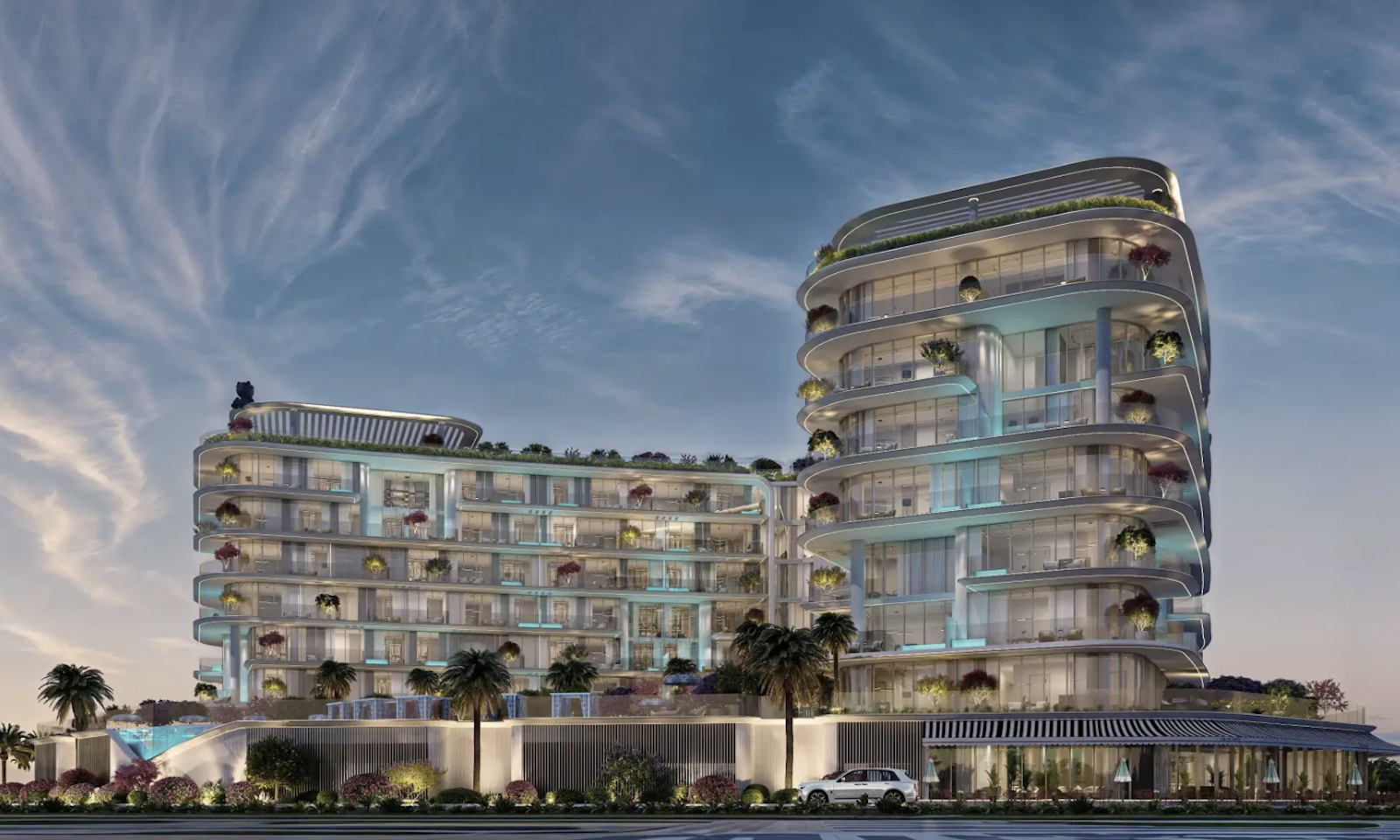 Инфраструктура комплекса: студия йоги, пространства для предприятий общественного питания, частные бассейны, бассейн, детская игровая площадка и бассейн, зоны отдыха, спортзал, саунаство.