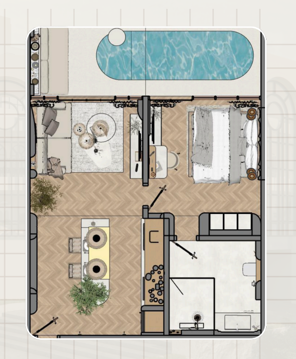 Инфраструктура комплекса: вертолетная площадка, корт для падель-тенниса, тренажерный зал, коворкинг-процедуры и расслабляющий бассейн с пляжной атмосферой.