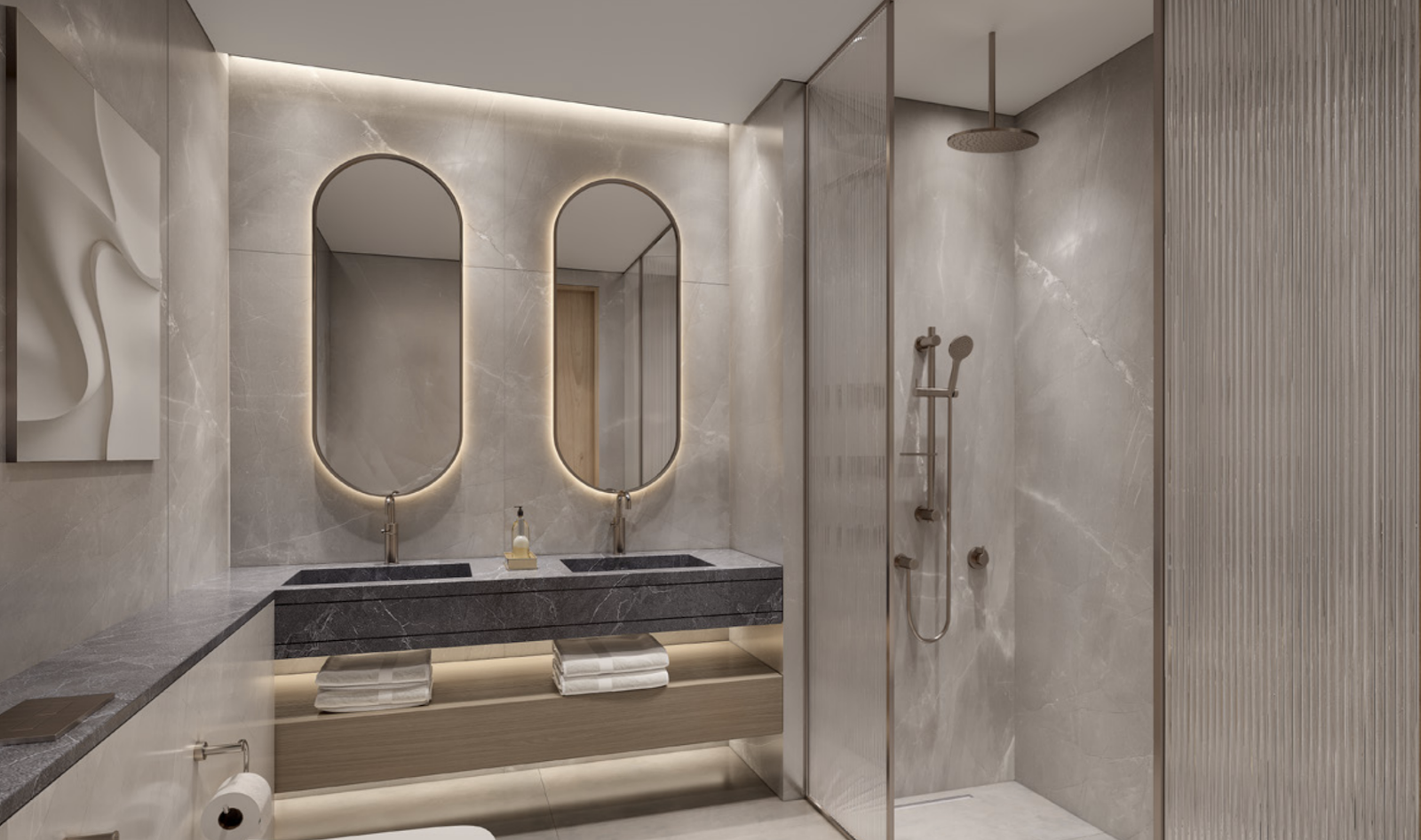 Базовая комплектация: интерьеры оформлены в современном стиле с использованием высококачественных материалов и светлых, изысканных тонов. Кухни оснащены встроенной мебелью и имеют чистые, минималистичные поверхности. Ванные комнаты отделаны светлыми материалами, современной сантехникой и продуманными деталями. Все жилые помещения выполнены в элегантном и функциональном стиле, характерном для бренда Hilton.