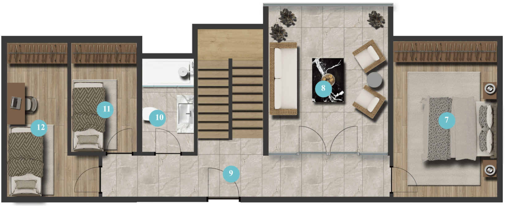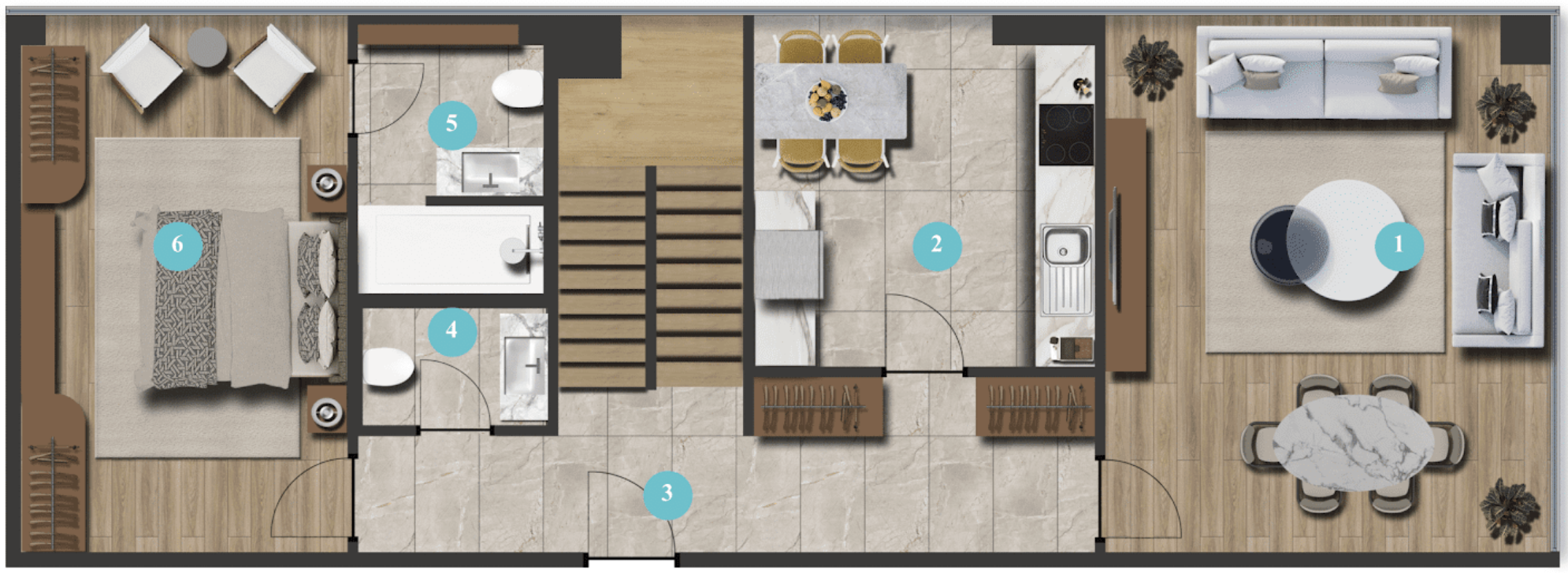 Местоположение: в непосредственной близости находится множество образовательных и оздоровительных центров, как частных, так и государственных, а также торговые центры. Комплекс расположен всего в 5 минутах от живописной улицы Багдат и пляжа.