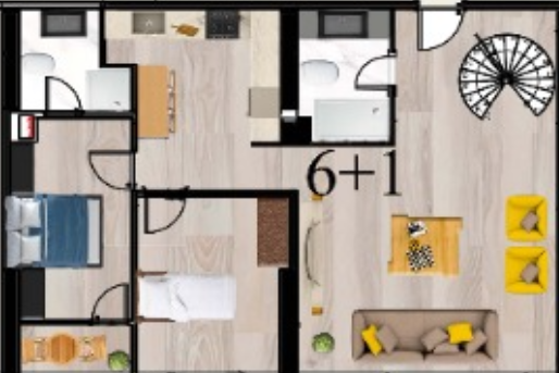 Формат: кухня-гостиная и 6 спален.