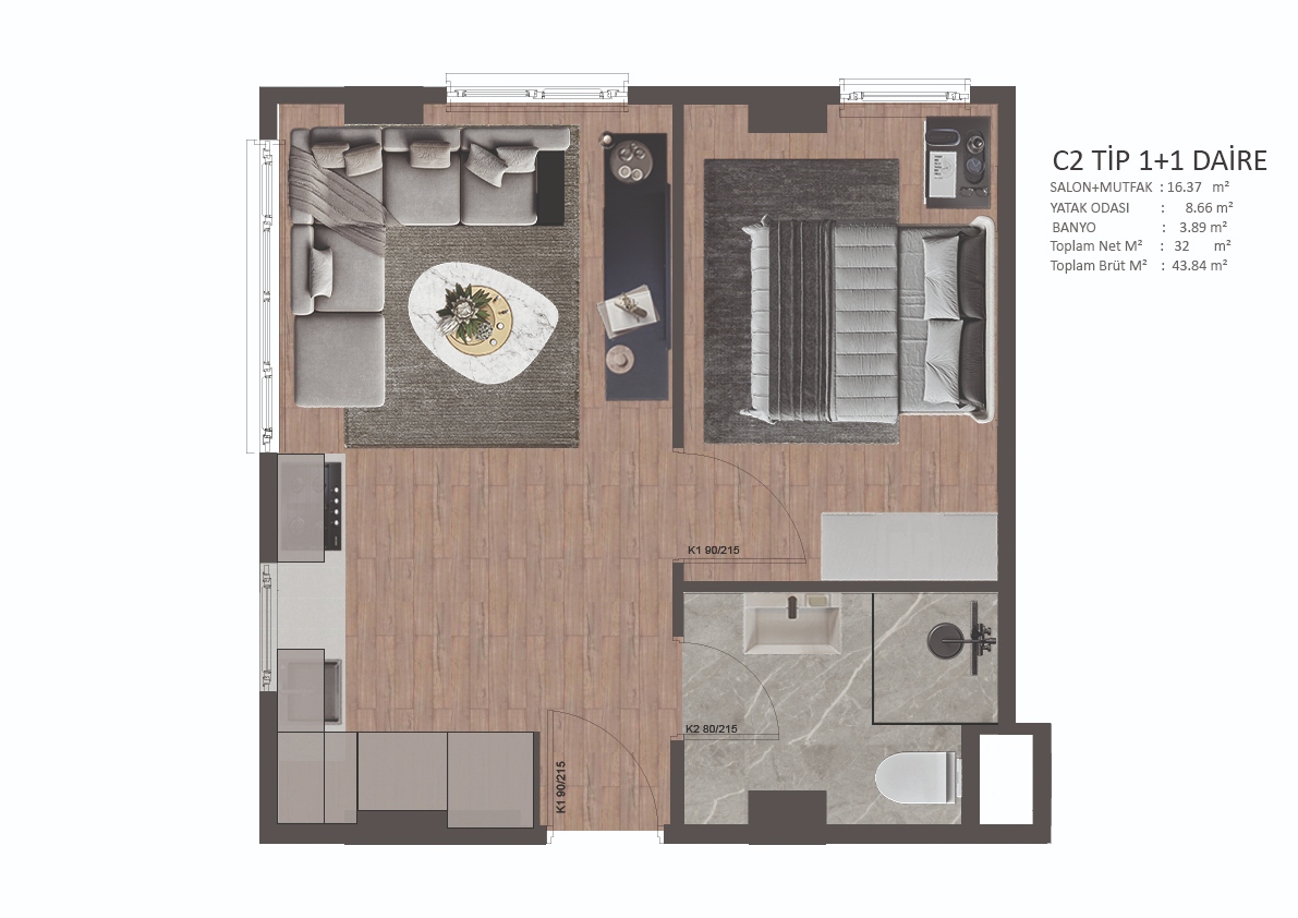 Формат: кухня-гостиная, спальня и санузел.