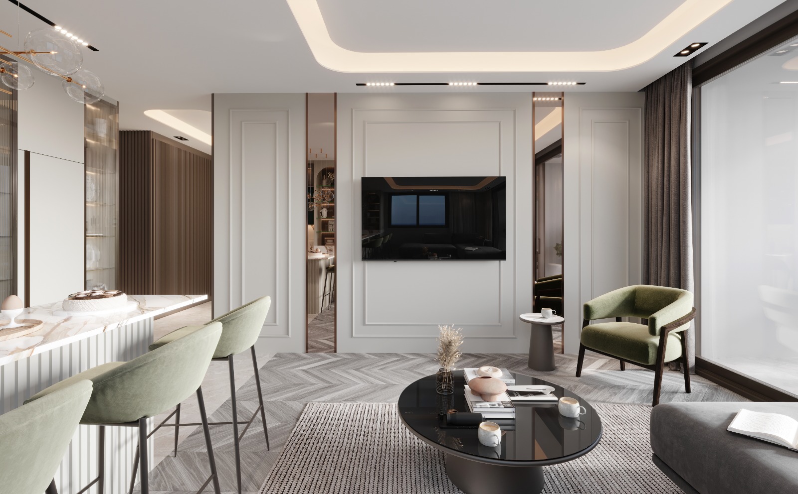 Квартиры сдаются с чистовой отделкой: тёплый пол в каждой комнате, ванные комнаты с отделкой из керамического гранита, кварцевая кухонная столешница, качественная мебель и фурнитура, центральная спутниковая система, система сейсмозащиты Jet Grout, подвесной потолок, кухонный гарнитур, гардеробная, шкаф и зеркало в ванной комнате, стальная металлическая входная дверь, окна из ПВХ, стены окрашены качественной водонепроницаемой краской, декор стен – фотообои премиум-класса, полы – ламинат высокого класса, сантехника 1-го класса, душевая кабина 1-го класса.