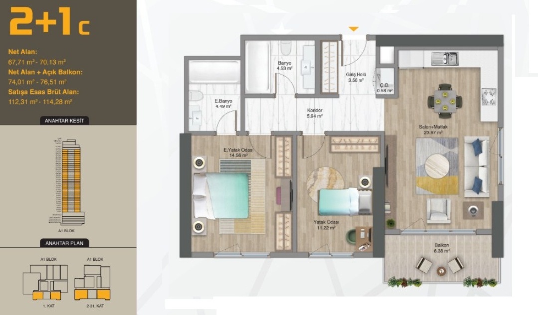 Площадь: от 112 до 142 кв.м. в зависимости от планировки.
