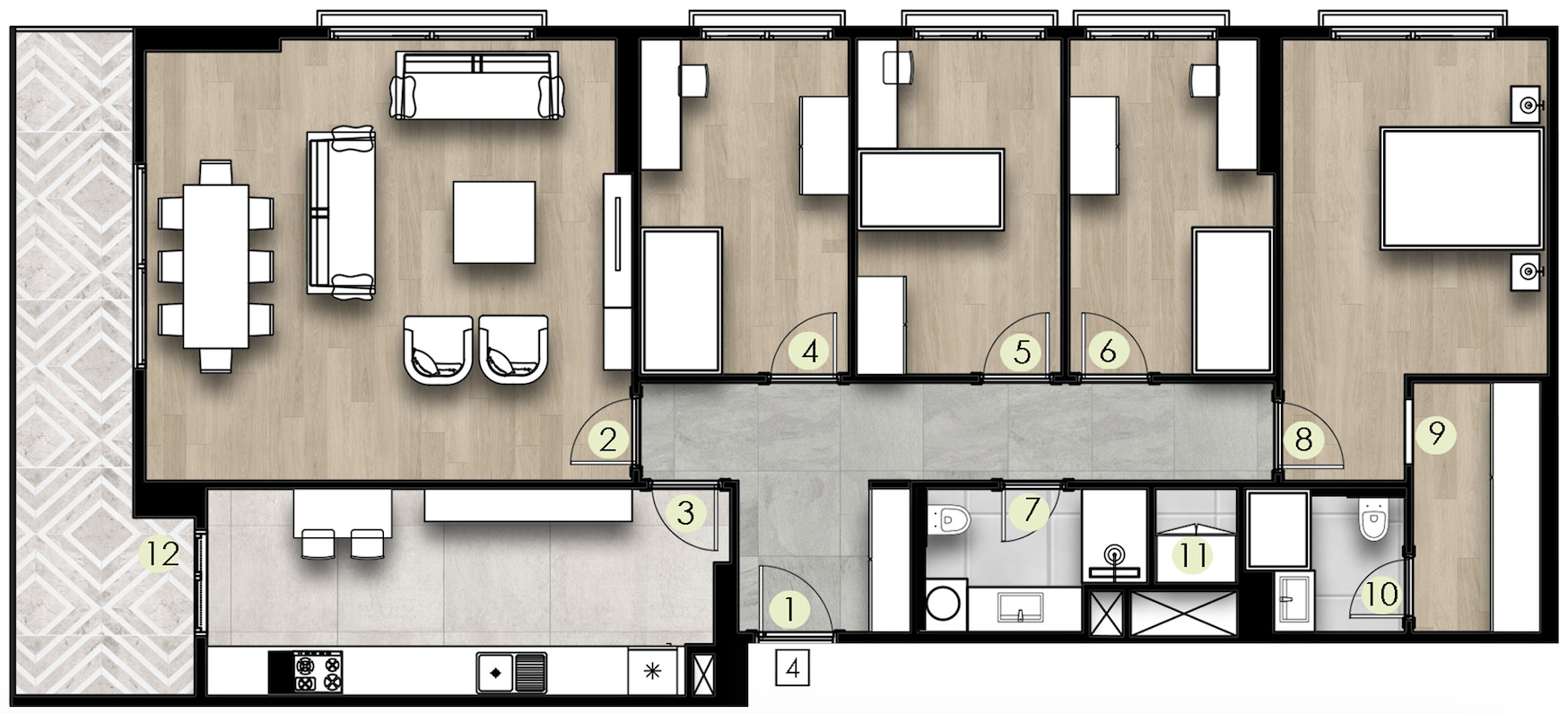 Формат: кухня, гостиная и 4 спальни.