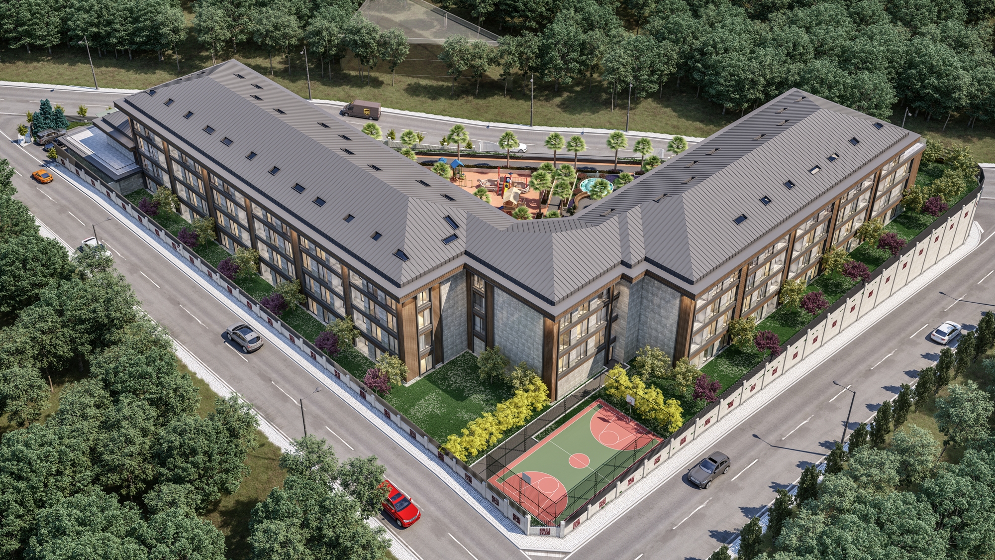 Инфраструктура комплекса: детская игровая площадка, специальная пешеходная дорожка, крытый бассейн, тренажерный зал, сауна, парная, баскетбольная и футбольная площадки. В рамках проекта для каждой квартиры будет отделено 2 парковочных места.