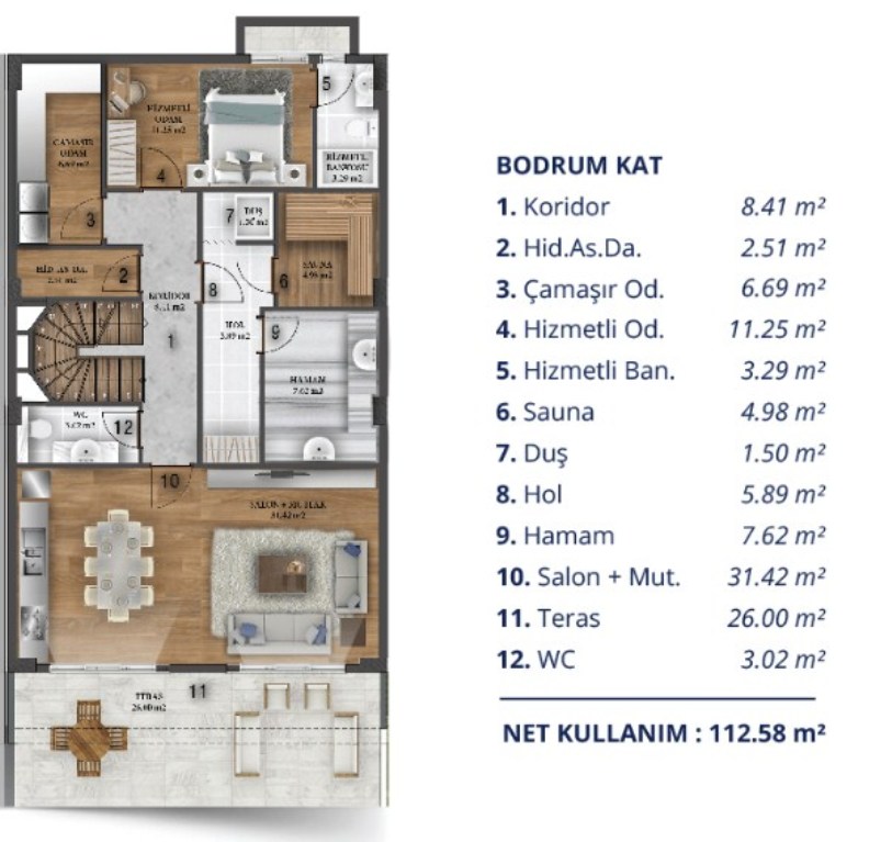 Инфраструктура комплекса: частный кинотеатр, лаунж-зоны, бассейны, комнаты для водных процедур, различные виды фруктовых садов, кафетерии, спортивные сооружения, турецкая баня, детские площадки, сауна, фитнес, молитвенные дома, арт-клубы, видеонаблюдение.